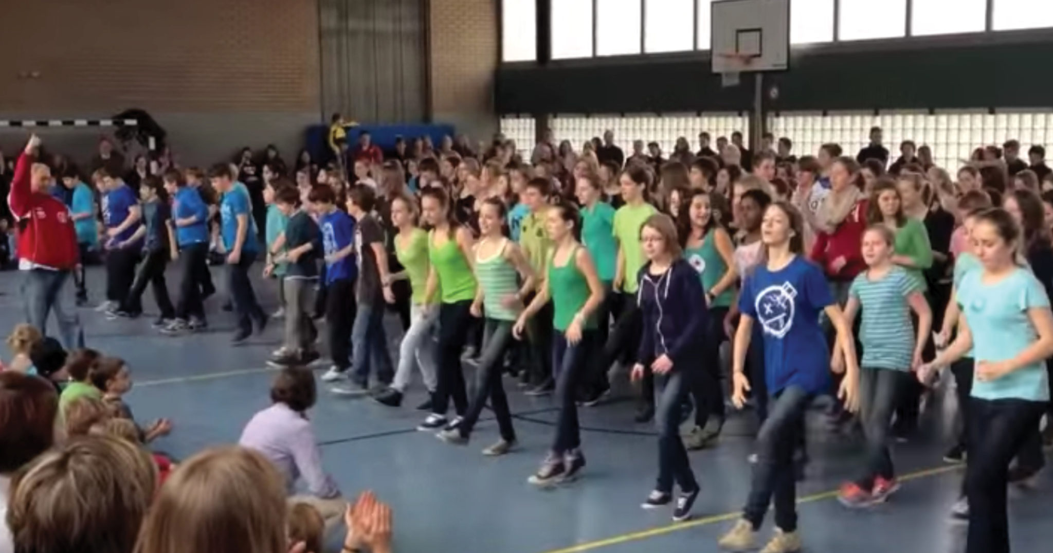They flooded the gymnasium to perform in front of their classmates, all hopping in time to the music.