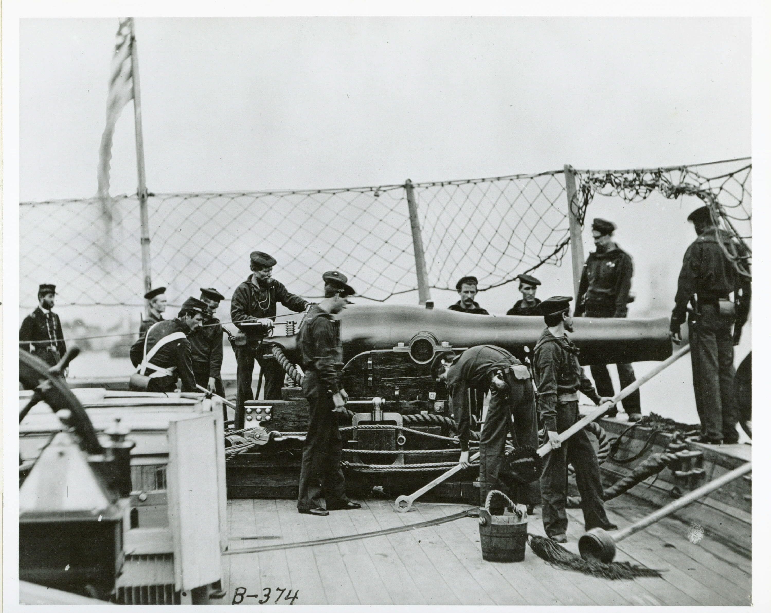 Not all of the Civil War fighting took place on land. Here is a shot of some soldiers on a U.S. Naval warship positioning a canon to use in battle.