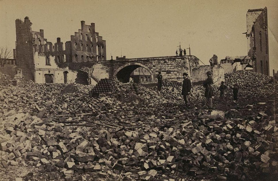 Many of the towns where battles were fought during the Civil War sustained major damage. This is a photo by Andrew J. Russel and it depicts soldiers surveying what was left of one section of Richmond, Virginia.