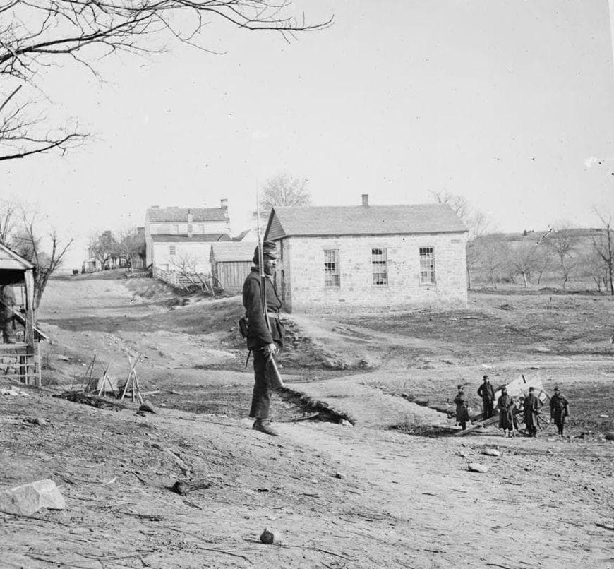 This shot by George Bernard shows a soldier standing guard on a hill in front of a churchhouse. This photo was taken in March 1862 between the two battles at Bull Run.