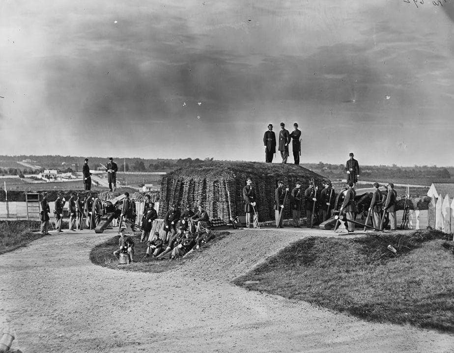 This photo, taken by William Morris Smith in 1865, shows Union soldiers set up to defend Fort Stevens in Washington DC. Notice the heavy artillery on each side of the shot.