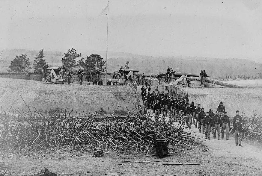 George N. Barnard snapped this shot of Confederate soldiers and their fortifications somewhere near Atlanta, Georgia, in 1864. Those canons look big and ready to be fired. I wouldn’t want to storm this heavily fortified location.