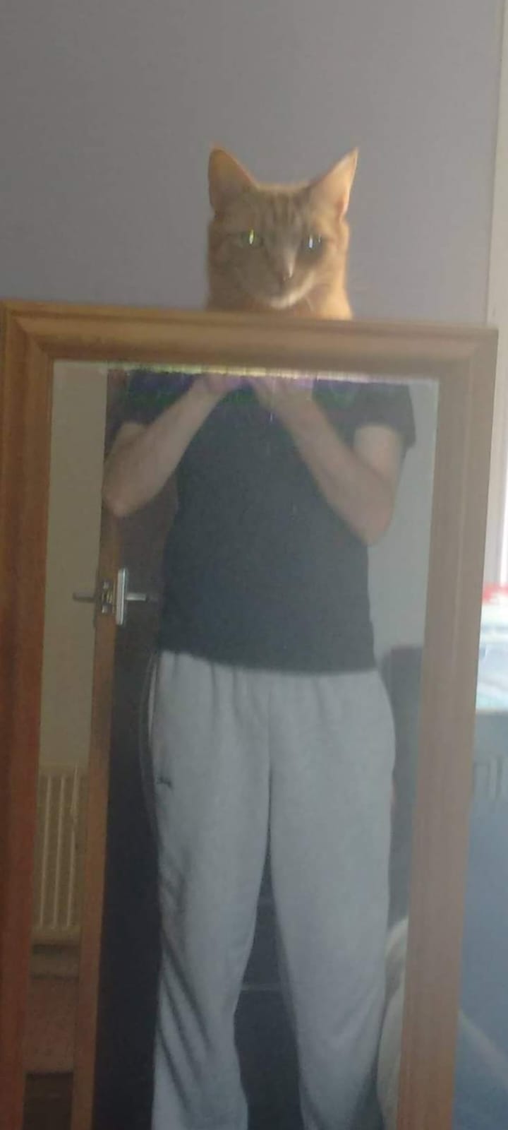Aside from the feat of taking this photo somehow, I get unreasonably upset that this cat isn’t included with the purchase of this mirror. At least I can look at myself, and I’m pretty cute too.