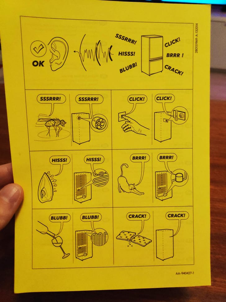This helpful piece of paper came with certain models of refrigerators. The aim of this helpful handout was to let refrigerator owners know what the sounds they heard coming from their refrigerator were. This helped set their mind at ease when they heard these sounds.