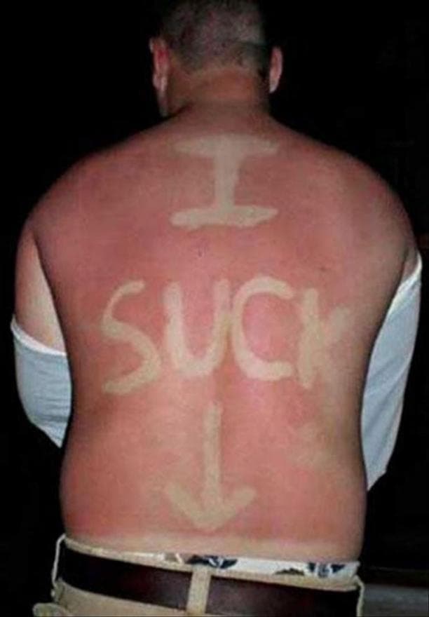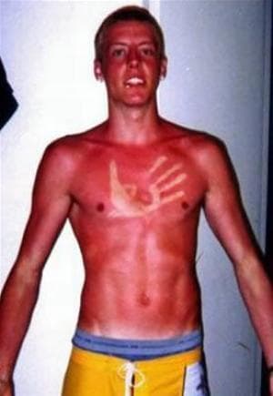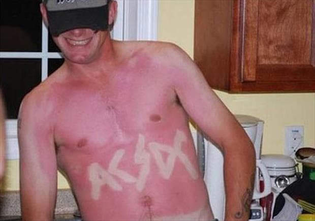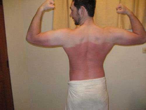 This guy is playing it off with a silly pose, Even so, that sunburn honestly looks terrible. And how did he manage to get burned on just the lower half of his back?