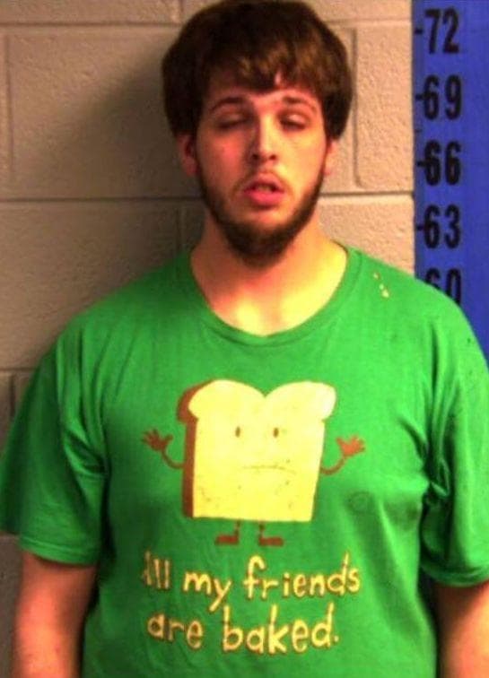 This doesn’t seem like the best shirt to wear if there is even the slightest chance you might get in trouble with the law. Judging by his expression, he may have been imbibing himself.