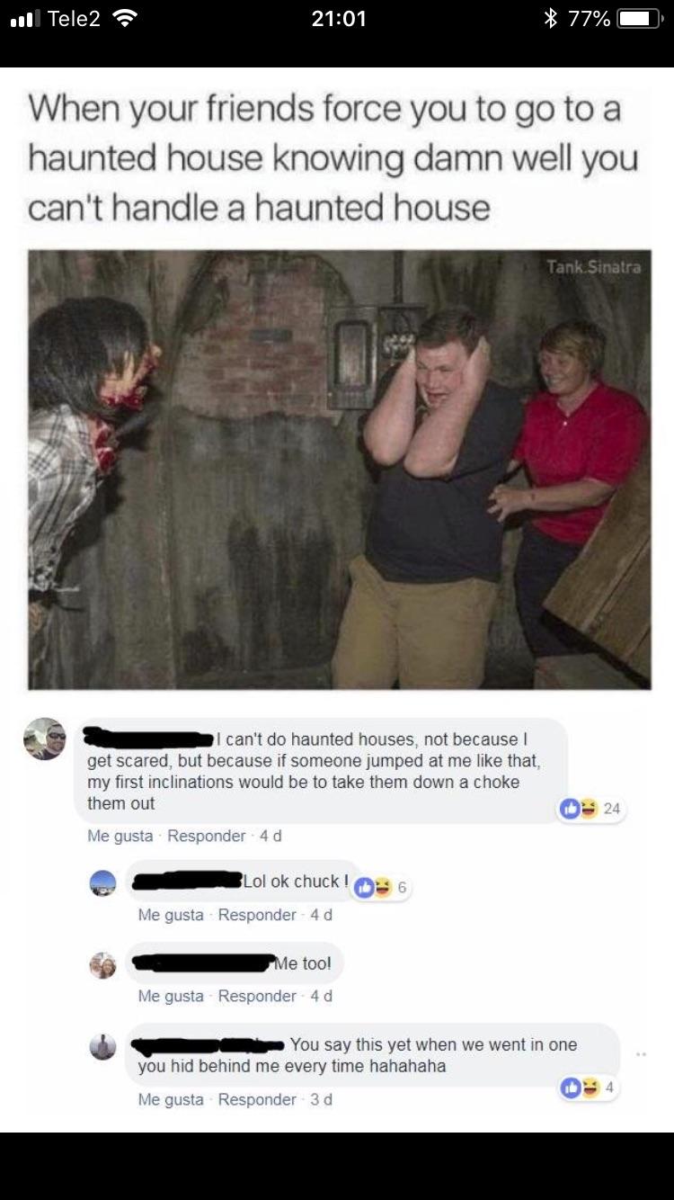 Look, haunted houses are scary and no one would seriously fault him for being nervous by going to one. But we’re going to laugh at a grown man pretending to be tough when he was actually scared out of his wits.