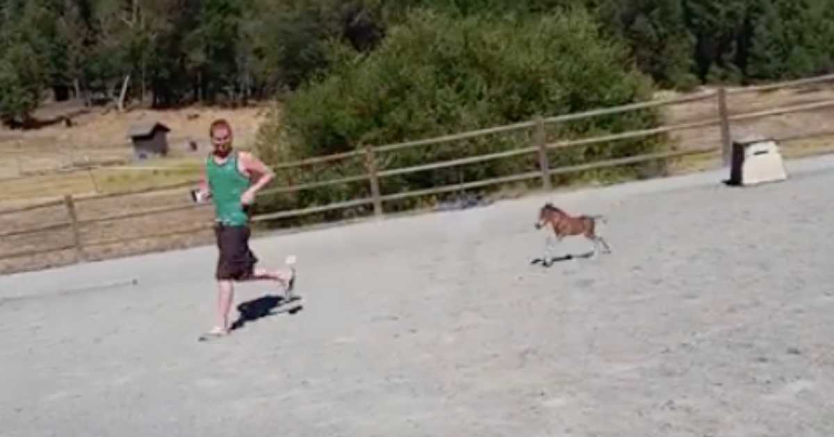 This baby miniature horse came out of the womb ready to run, only 72-hours into the world and he’s already going viral for this adorable game of tag.