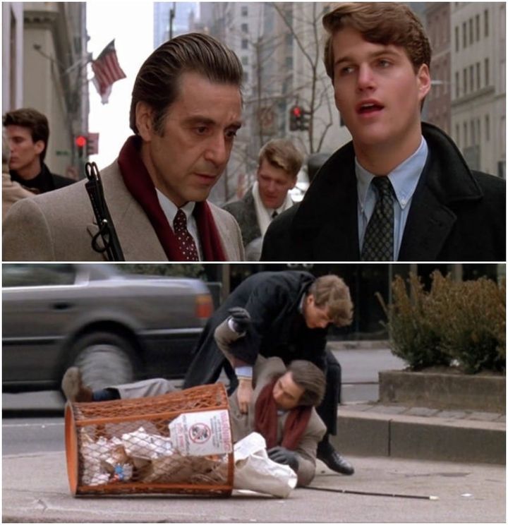 His vision being somewhat compromised because of that, he accidentally falls over a garbage can. The respect for Al Pacino just went to a higher level.