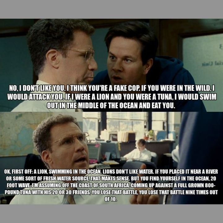 A bizarre scene from The Other Guys has Terry telling Allen that if he were a lion and Allen was actually a tuna, he would get himself into the ocean and eat Allen.