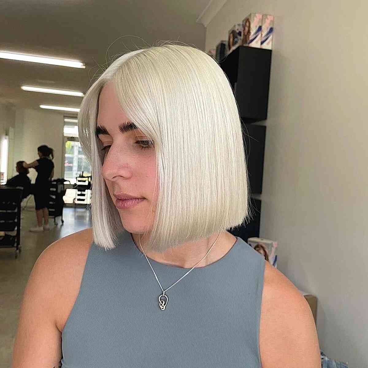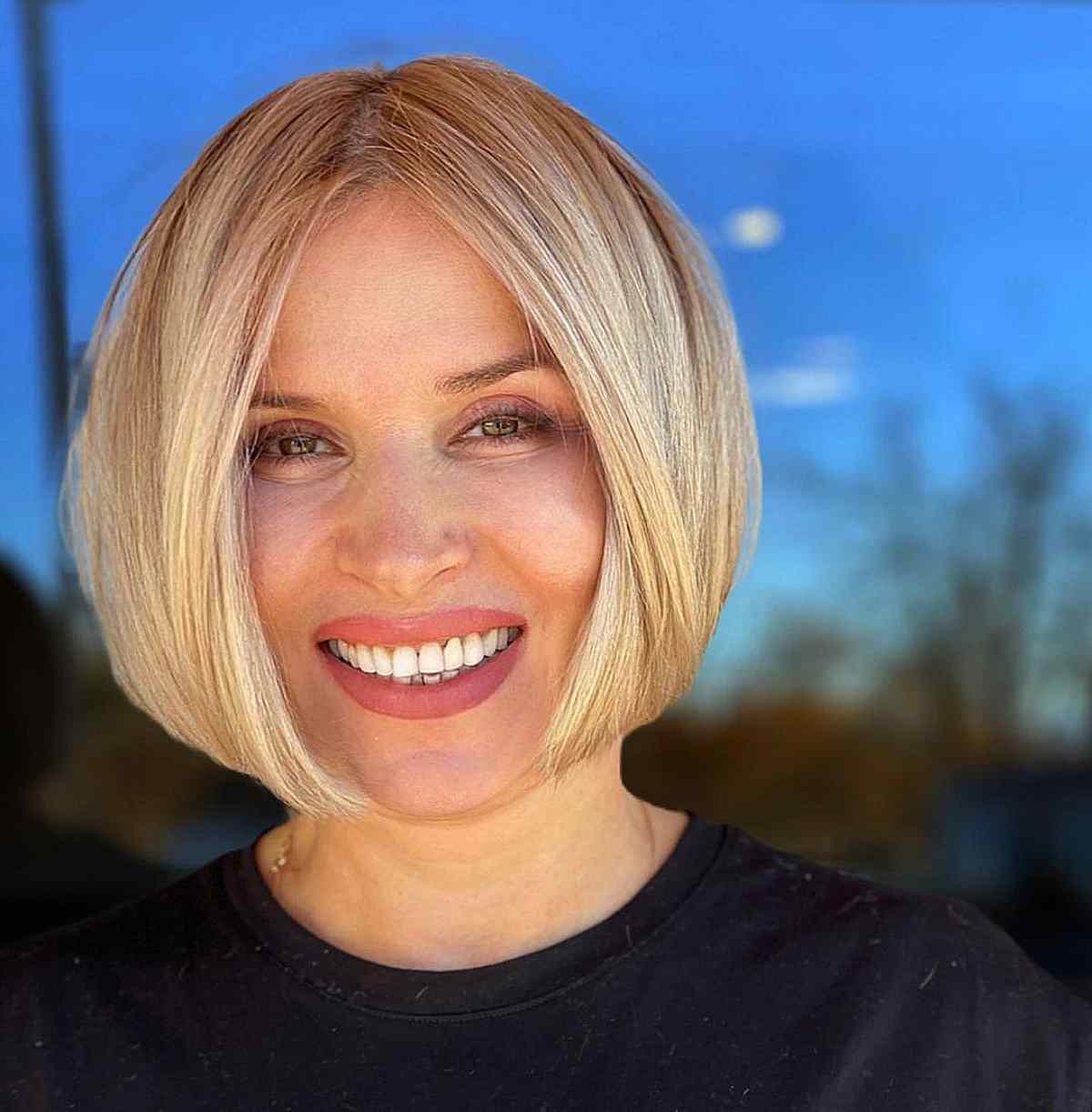 Go for a soft, no-bangs blonde bob with a blunt cut at a uniform length. This style flatters most hair densities and is especially easy to maintain with straight or wavy textures.