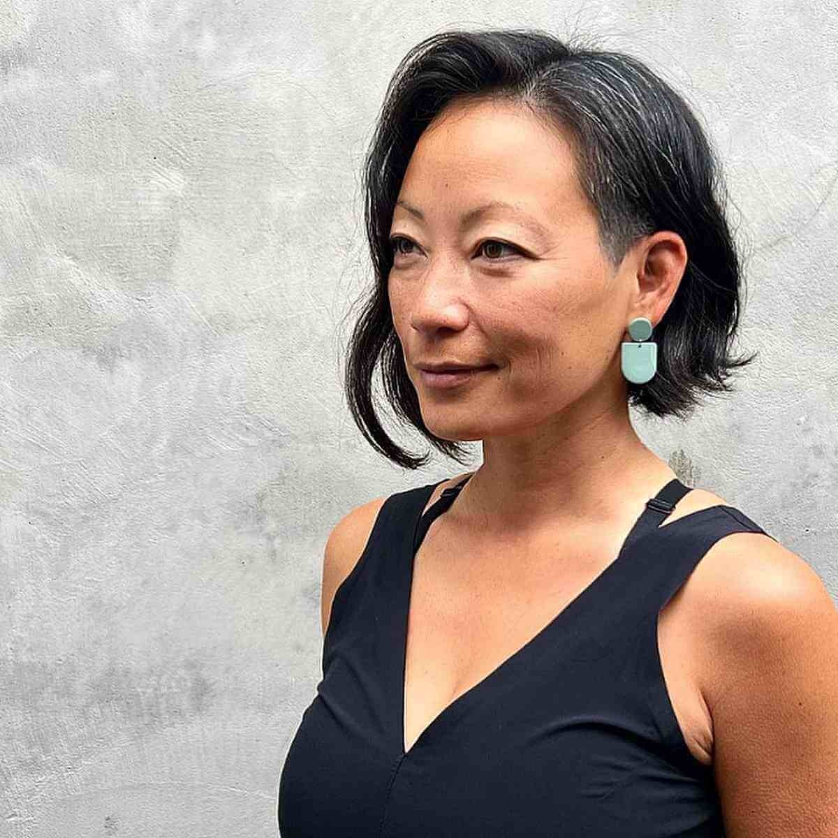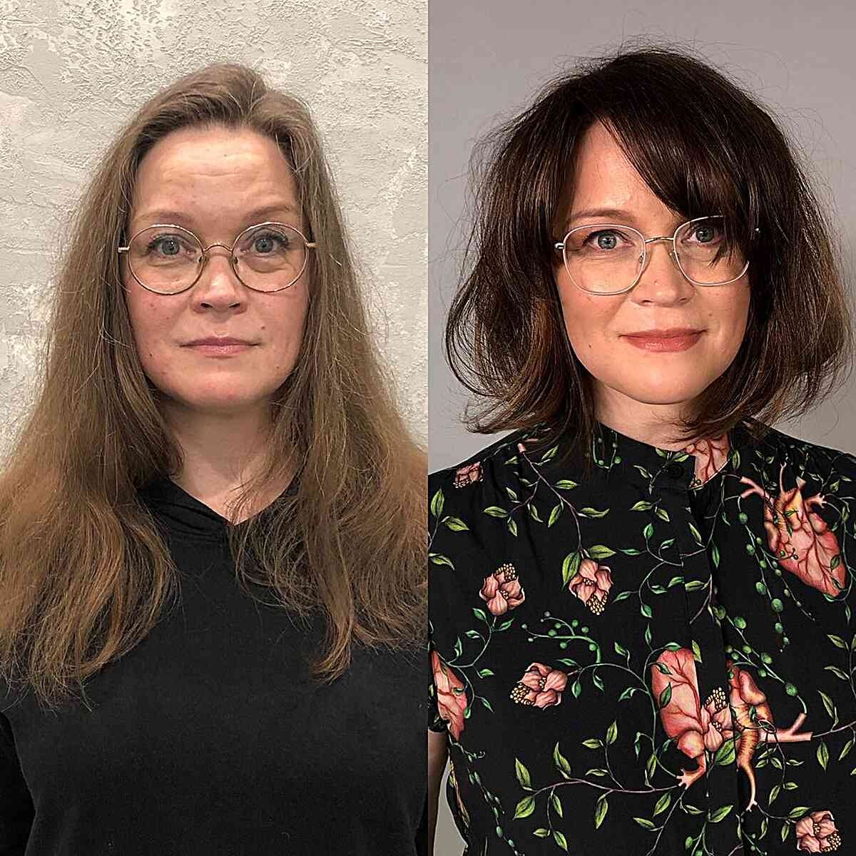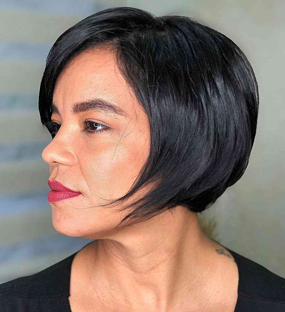 A medium bob with long, side-swept bangs is a timeless choice. The gentle, face-framing fringe is especially flattering for women over 40, creating a sultry and elegant silhouette.