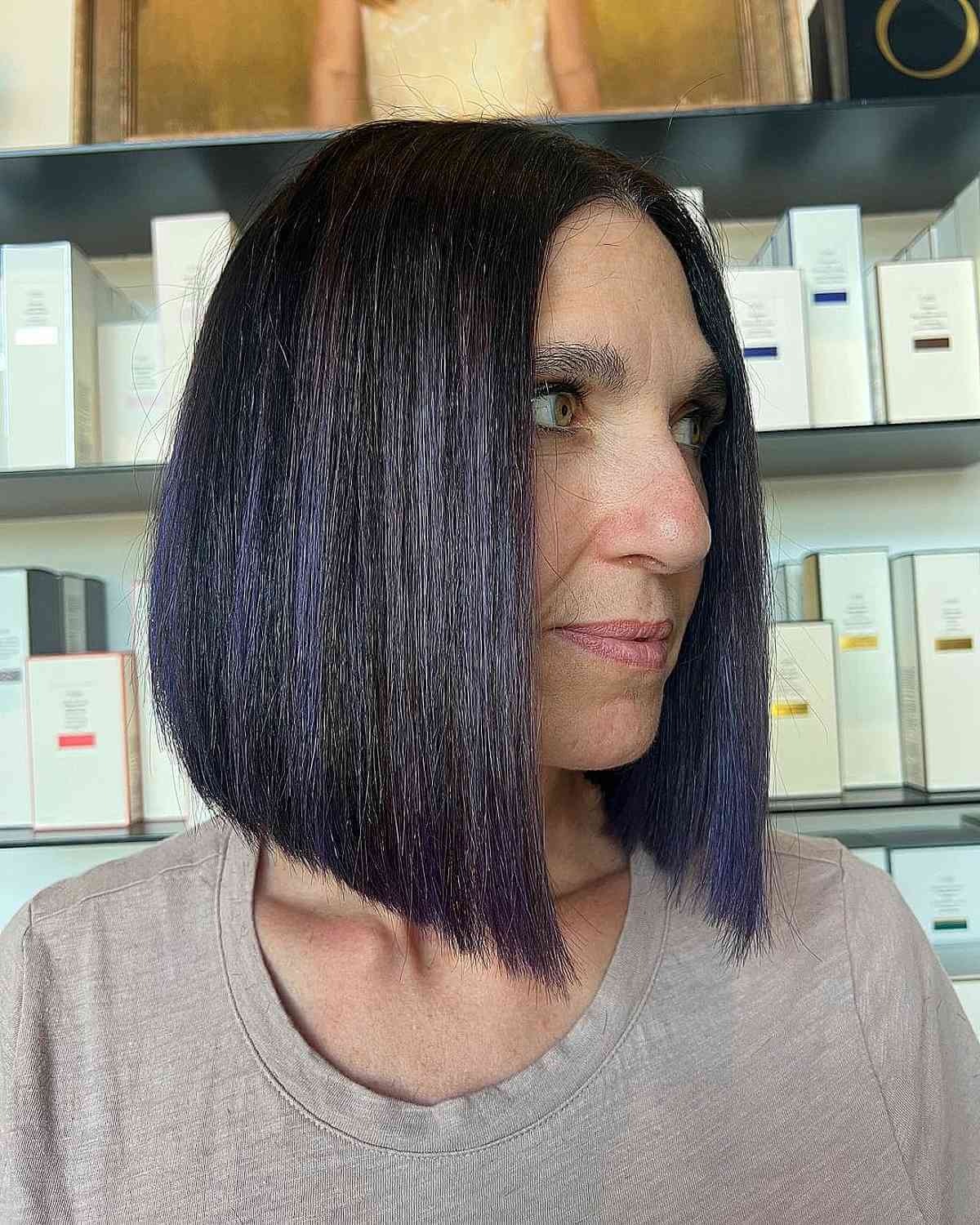 If you’re looking for a bold twist, go for a long A-line bob with subtle blue highlights. The contrast is fun and modern, making it an eye-catching style for women who want a unique, youthful edge.