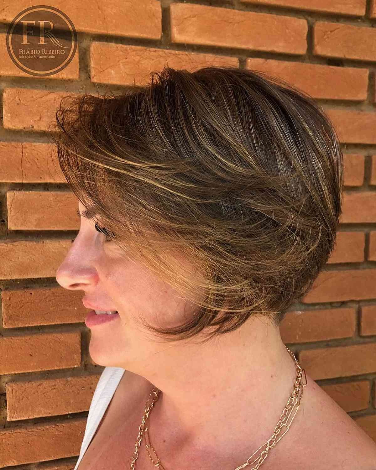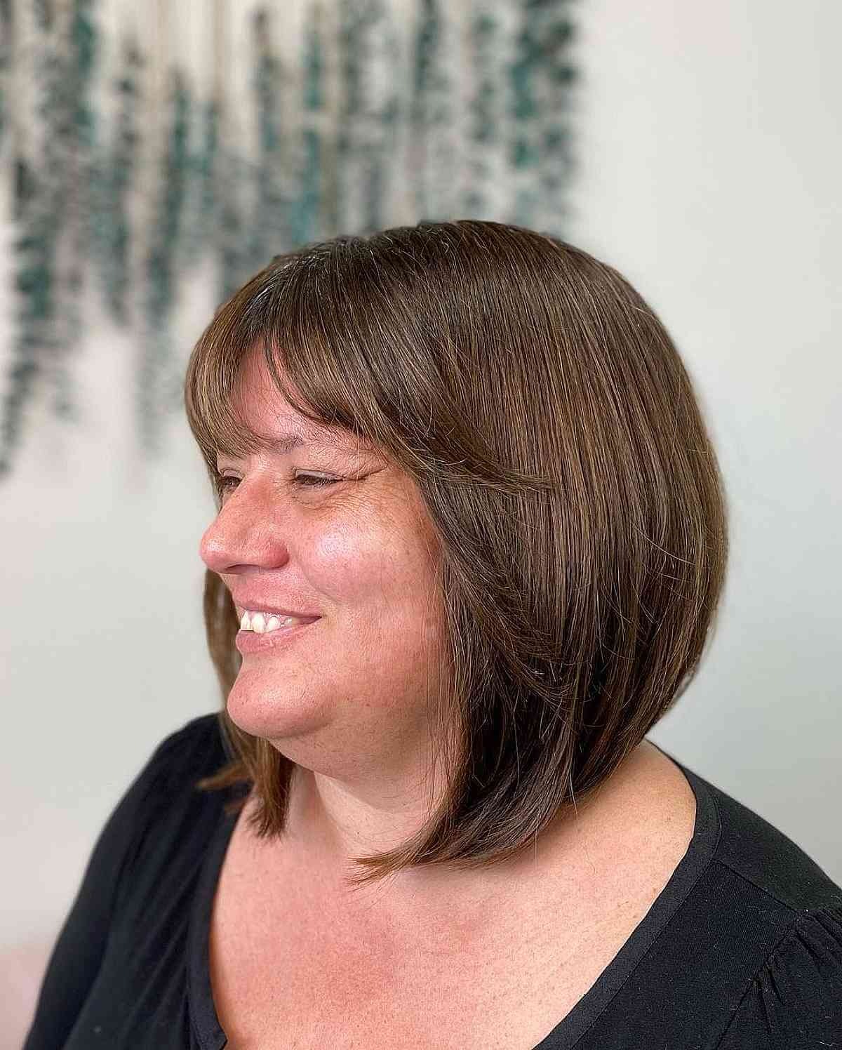 An angled bob with wispy bangs is a perfect option for women with fuller faces. The elongated front pieces help balance a wider jawline, while the lightweight fringe adds softness and movement.