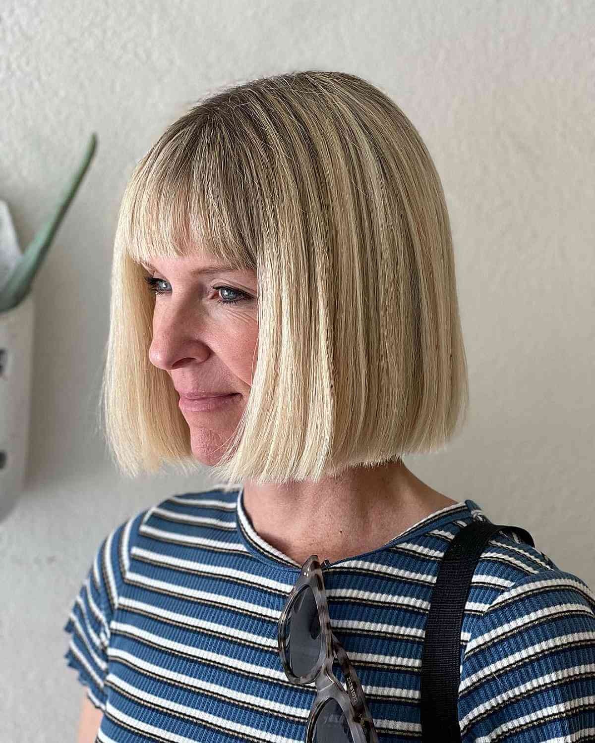 A long, blunt bob with bold bangs can truly make your features pop. This fierce style is especially stunning on women over 40 and adds definition around the eyes and neckline.
