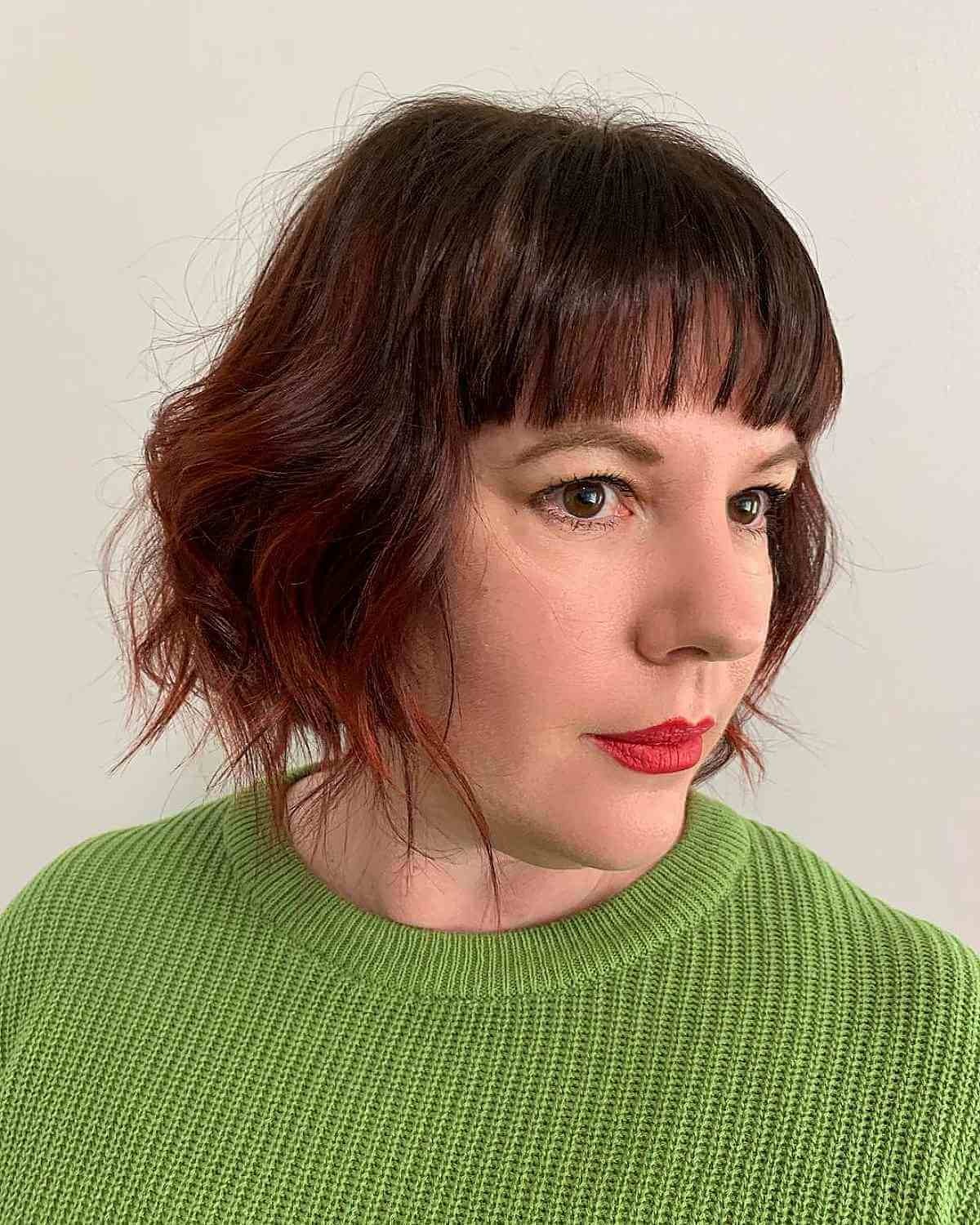 For a lively, youthful look, try a short wavy bob with straight-across bangs. This style is playful yet polished—a wonderful way for women over 40 to embrace both their elegance and their fun side. Consider a subtle red balayage for even more dimension and personality.