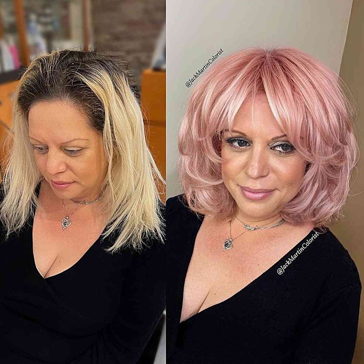 Want to make a bold statement? A feathered bob dyed pink is a fun, confident choice at any age. Remember, hair color has no age limit—embrace color if it brings you joy!