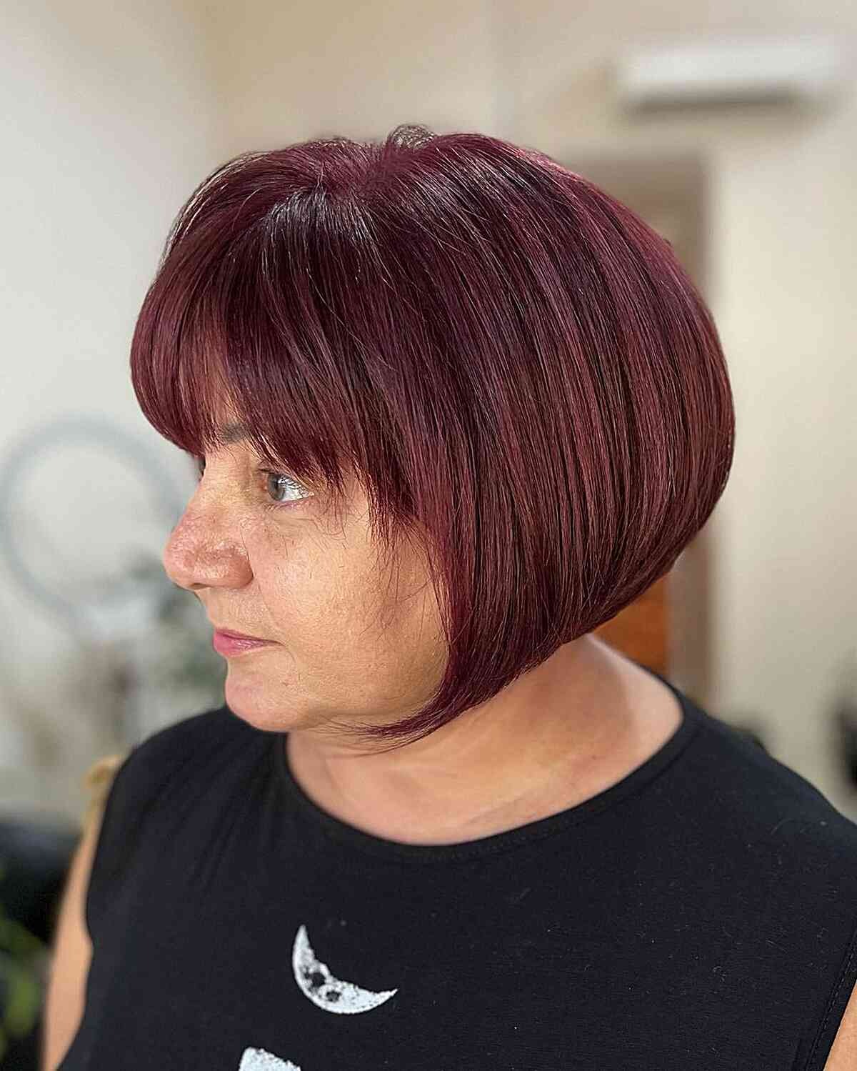 A rich dark chocolate bob is an effortlessly sophisticated choice at any age. This deep hue adds shine to aging hair, and the sharp, blunt finish looks fresh and modern. Face-framing bangs add softness and are especially flattering for women who wear glasses.