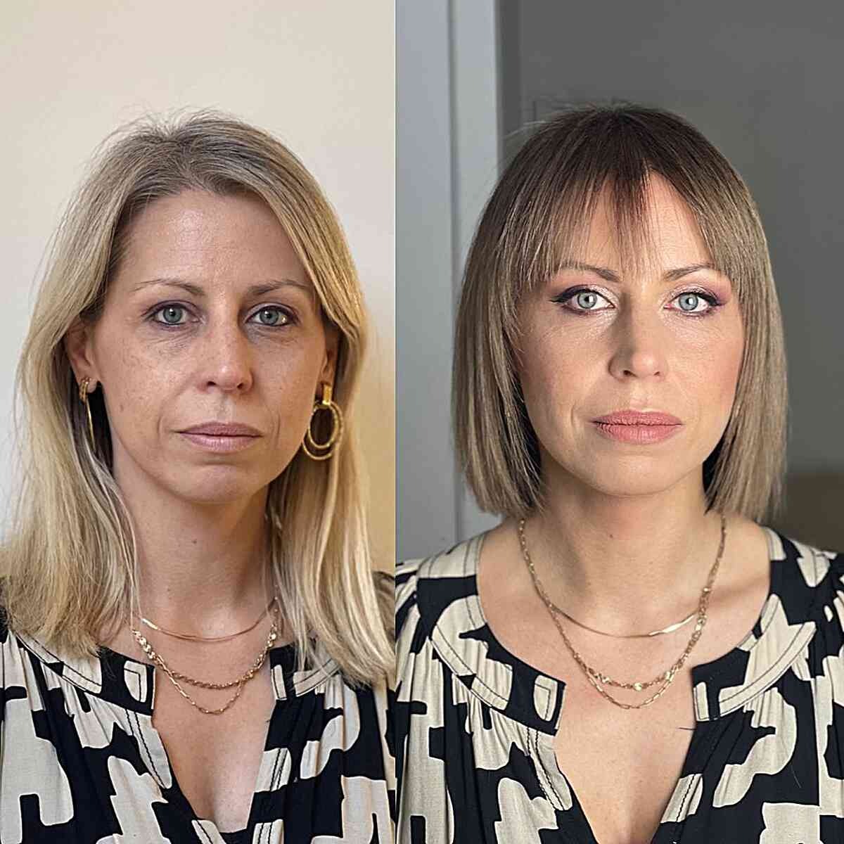 A blunt bob with bangs is a smart option for a square face. The structured style breaks up strong angles, while bangs draw attention to the eyes, creating a beautifully balanced and dramatic transformation.