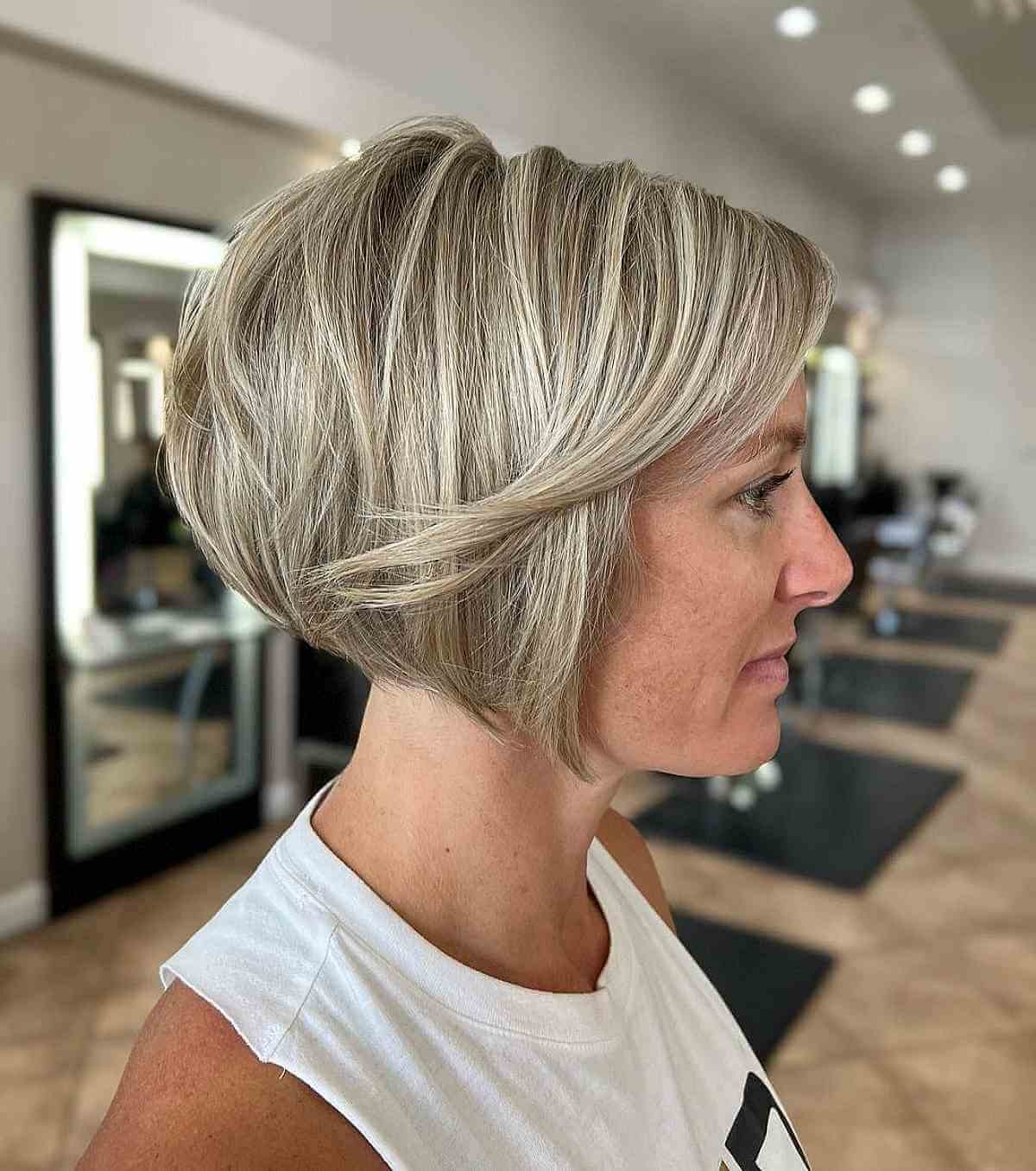 Short bobs help create the illusion of thicker hair as we age. Adding face-framing angles keeps length in the front, while shorter layers in the back give your style volume and fullness without losing softness.