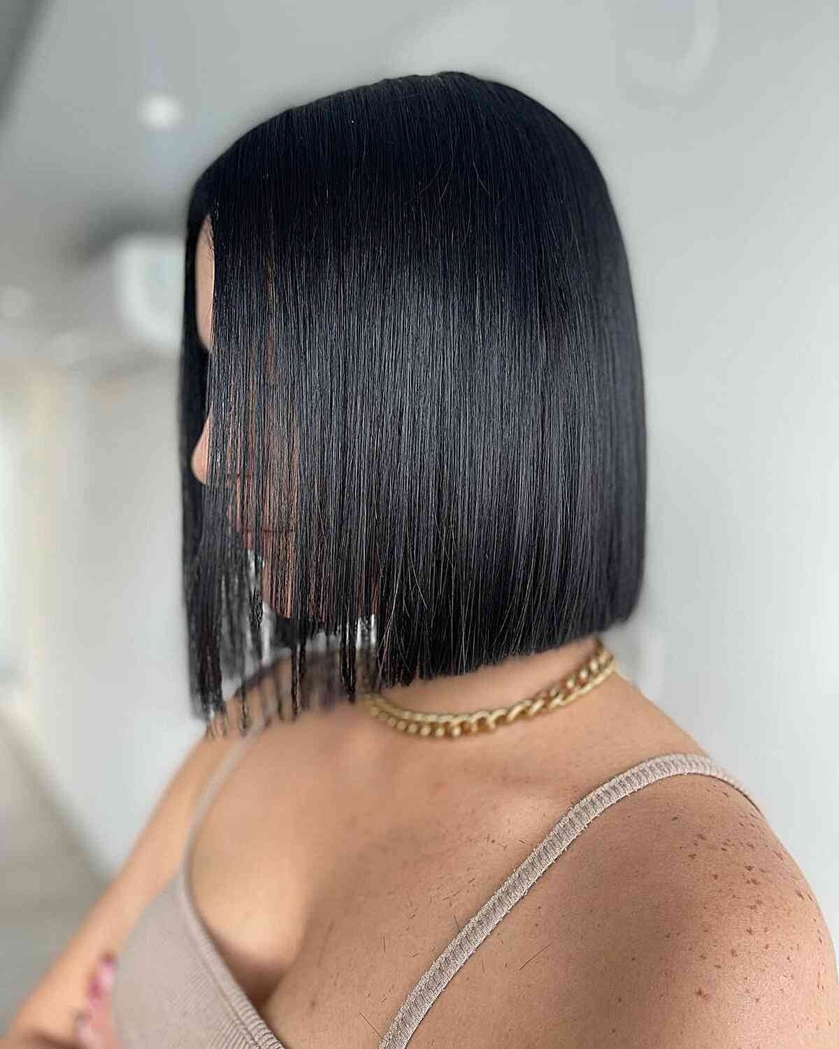 Want a bold, dramatic cut? A blunt bob at neck-length offers a clean, strong shape that enhances thickness. Deep brunette or natural tones add to the chic, polished effect.