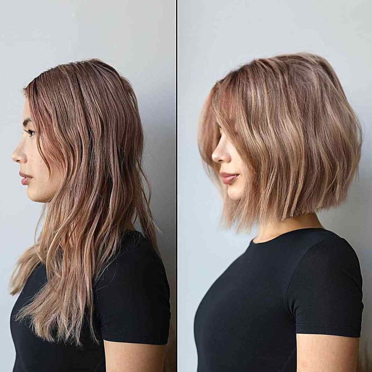 A soft, blunt bob is a classic choice for women with thick hair. It offers a fresh and manageable look that’s perfect for transitioning from long hair. This style feels chic, light, and easy to maintain all season long.