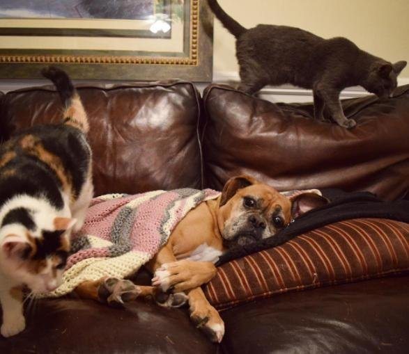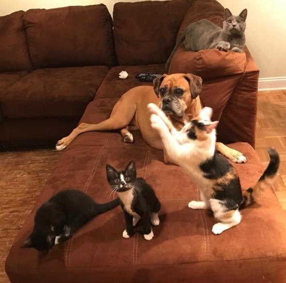All of the animals get along great and work together with Kelly to help her care for the foster kittens that come to her home.