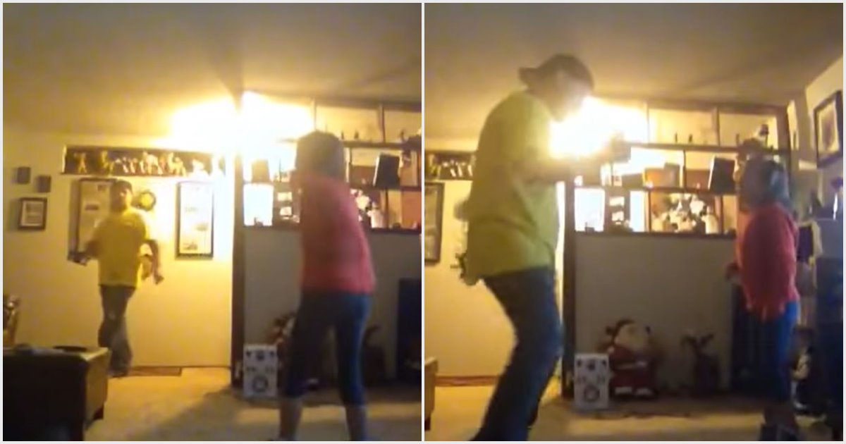 To finish off the routine, Kyleigh gets her dad’s attention and makes him follow her lead to pull off one final move. He does a great job and sets off in style, grabbing his beer once more and leaving the room.