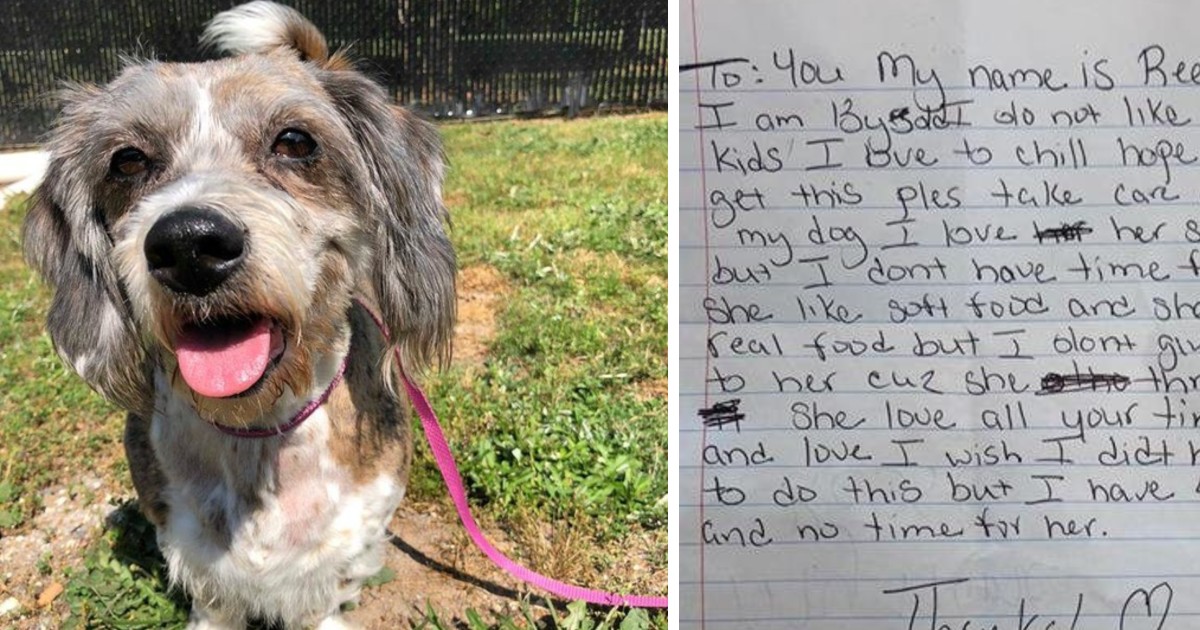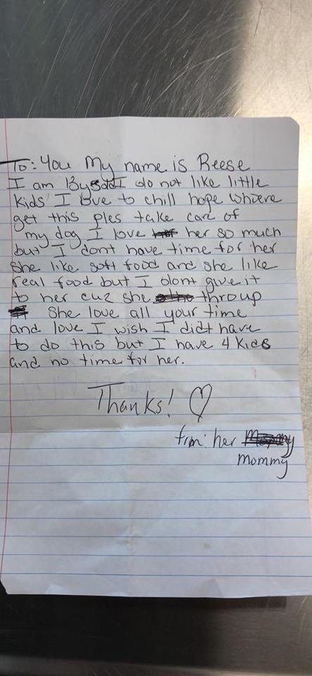 My name is Reese. I am 13-years-old and I do not like little kids. I love to chill. I hope whoever gets this [will] please take care of my dog. I love her so much, but I don’t have time for her. She likes soft food and she likes real food but I don’t give it to her cuz she throws up. She love all your time and love I wish I didn’t have to do this, but I have four kids and no time for her.” The note was signed, “Thanks, her mommy.”