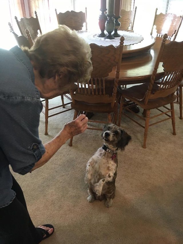 The dog was left on a woman’s property, and lucky for Reese, that woman took the senior dog into her home.