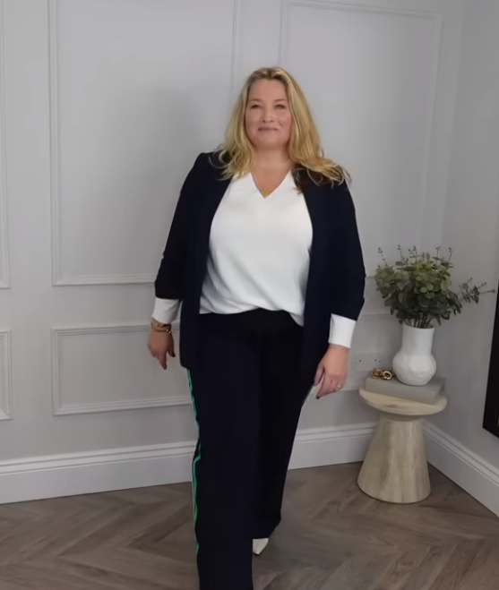 Always wear a tailored blazer if you want to make sure that you have that hourglass shape. The seam is on top of the shoulders and creates that angle that makes you look slimmer.