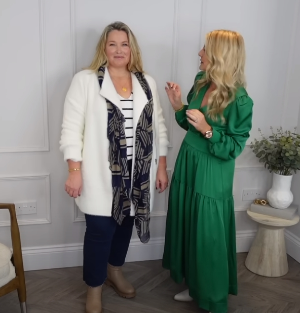Do you see what happened when they added a long, contrasting scarf down the center of her body? It elongated her body. Now the eyes are drawn to the length of the body, instead of the width.