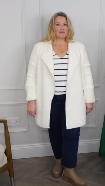 Another way to lengthen the legs is to tuck in your shirt. When you tuck in your shirt, it automatically lengthens your pants. And if you add a long blazer, coat, or jacket, it’ll hide your tummy and add more length.