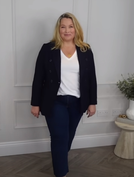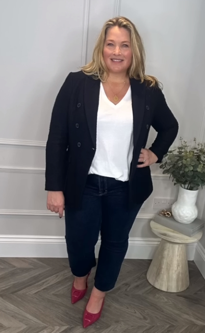 Because it’s tailored, the blazer slims down by the waist and tapers off again by the hips. It creates the slimmer shape you want.
