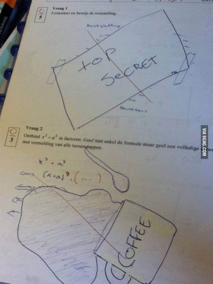Don’t you hate it when your student turns in a perfectly correct test, but some of the answers are classified and the rest are covered by coffee stains? Guess you’ll just have to give them an A.
