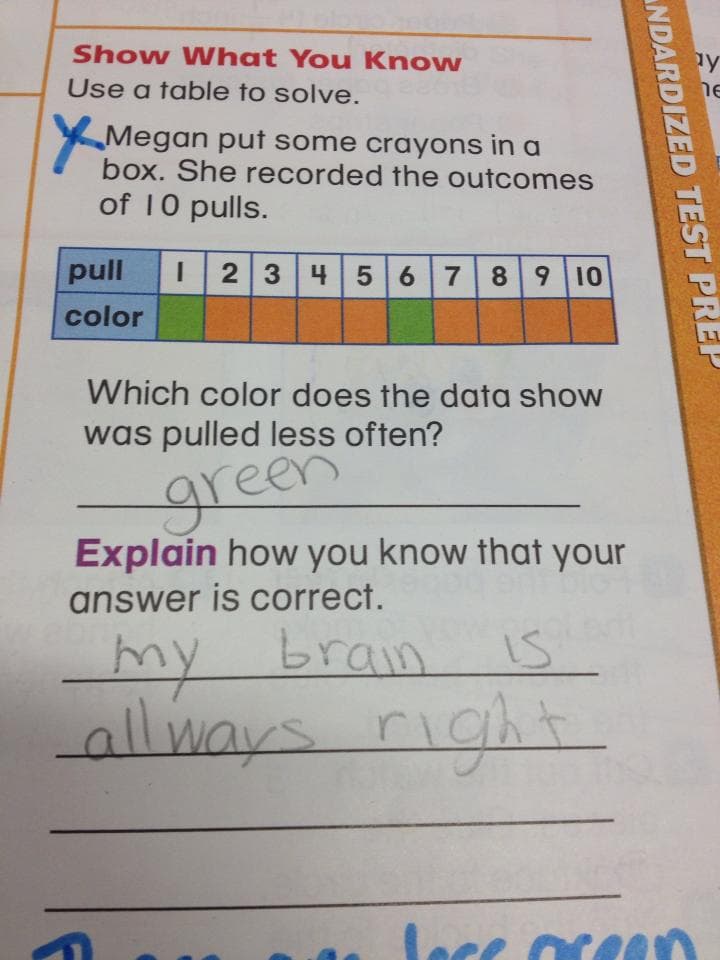 You’ve got to admire a kid who’s this gutsy and who cares so little about the results of a test. Why do I feel like this might be a kid who’s getting close to graduation?