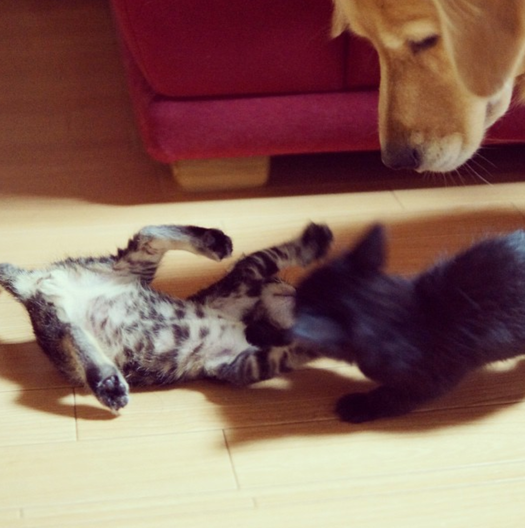 Ponzu’s caregiving duties even included watching over the kittens as they played together – surely something which is every mom’s worst nightmare!