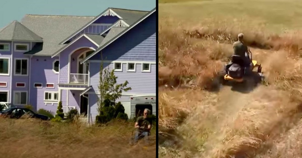 Guy mows message in yard after being upset about neighbors’ big purple home