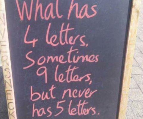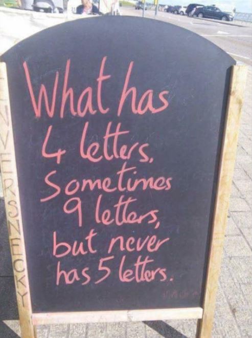 “What has 4 letters, sometimes 9 letters, but never has 5 letters.”