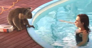Suddenly, a lady appears on the other side of the pool. She slowly makes her way over to the koala. She moves with caution, doing her best not to frighten it.