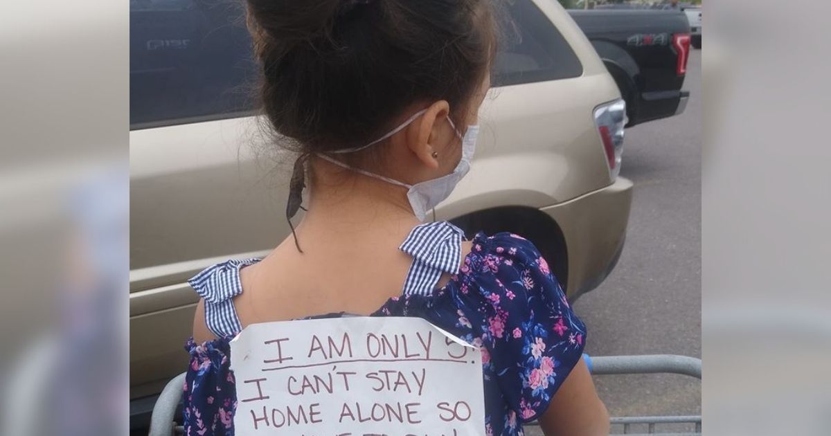 “I am only five. I can’t stay home alone so I have to buy groceries with mommy. Before you start judging, stay back six feet.”