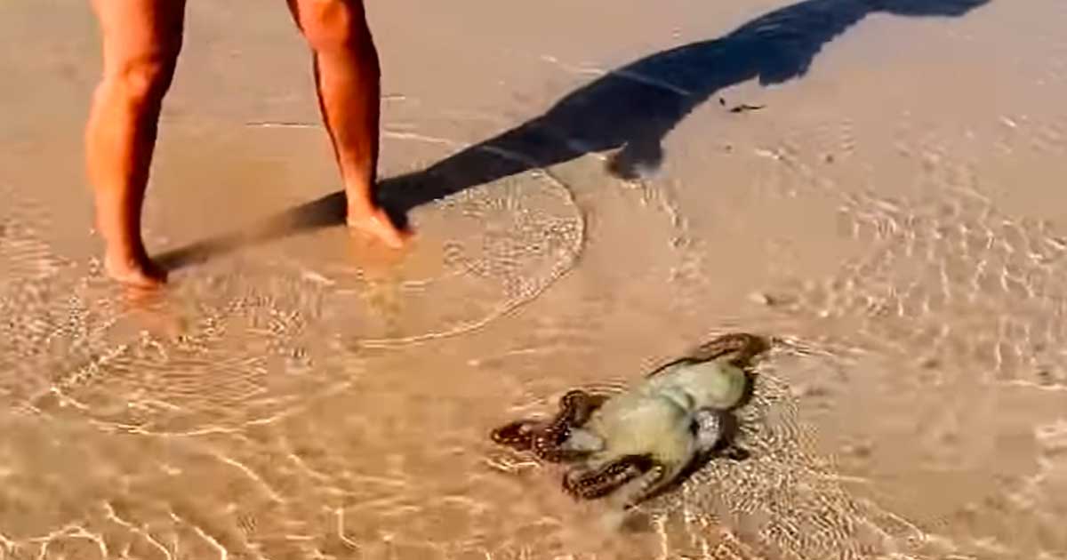 “We spent our Holidays at the Red Sea,” their YouTube video caption reads. “While walking along a lonely beach we saw a stranded octopus in the sand. We were not sure if he is already dead. So we pushed him back into the water.”
