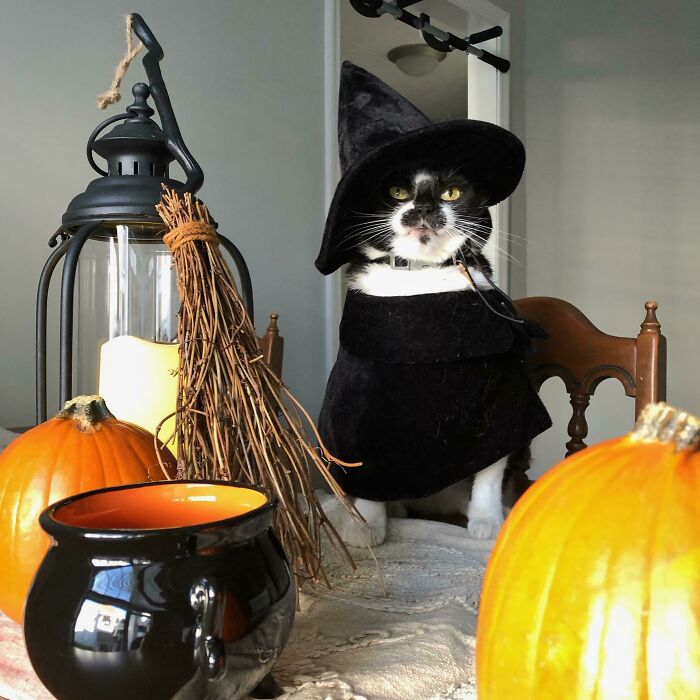 One thing we know about cats is that most of them hate dressing up. Even a post-op cone or a protective coat is enough to send our cat down into a depressive mood, so we couldn’t be brave enough to dress them up for Halloween! Admittedly, this kitty doesn’t look best pleased about the whole thing.