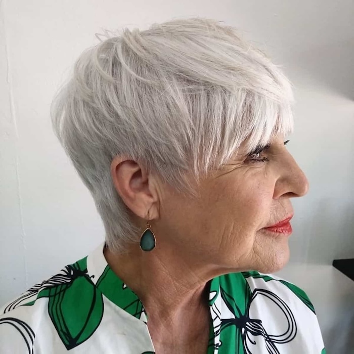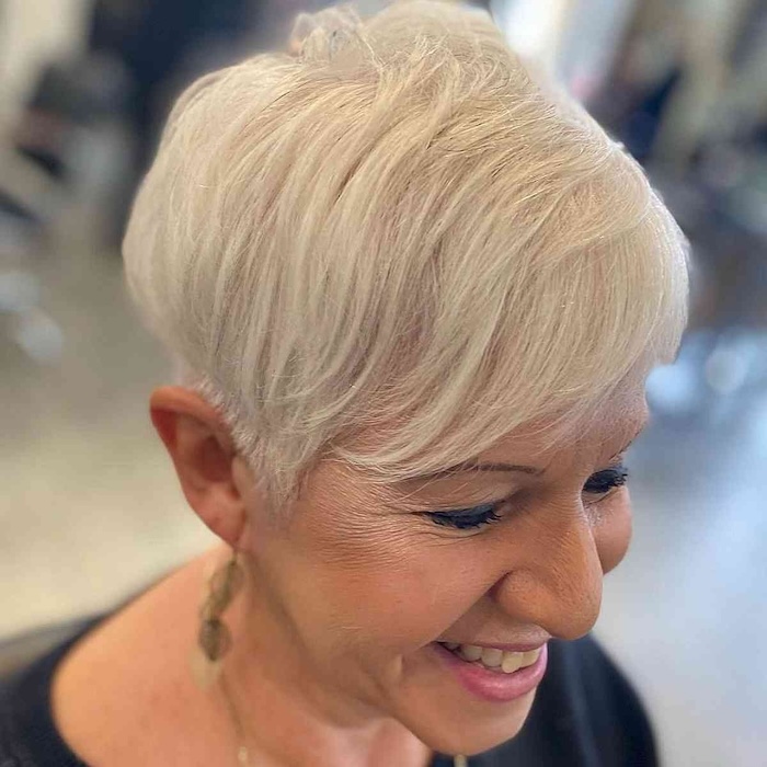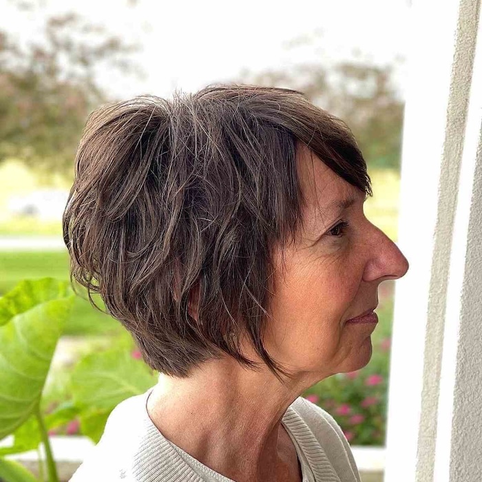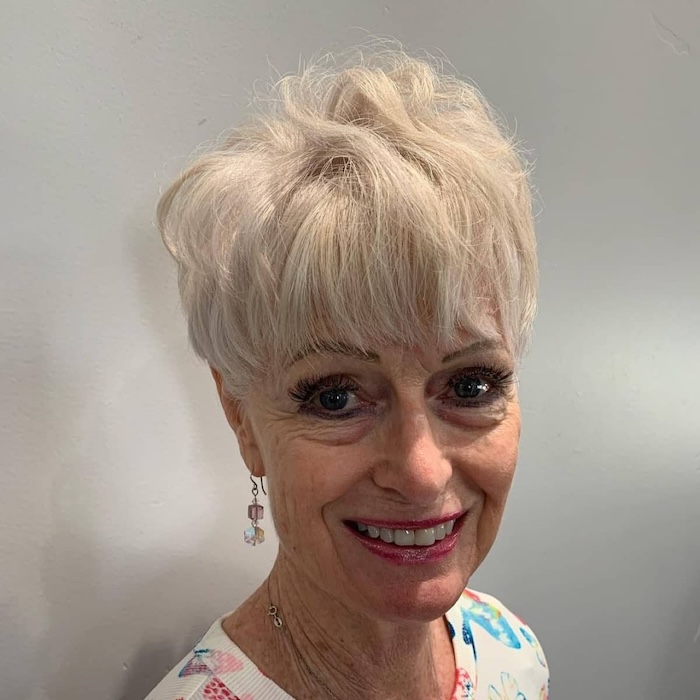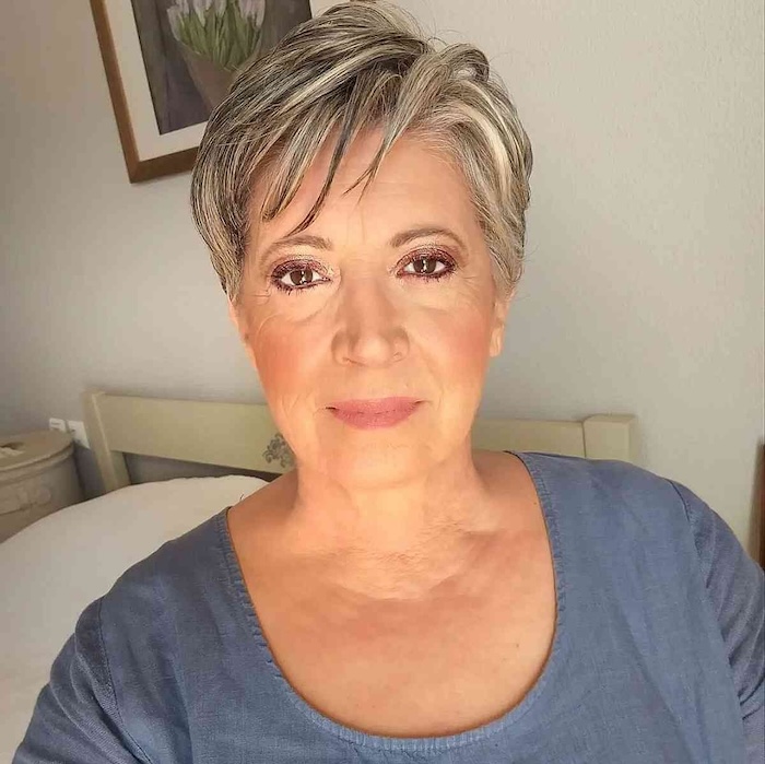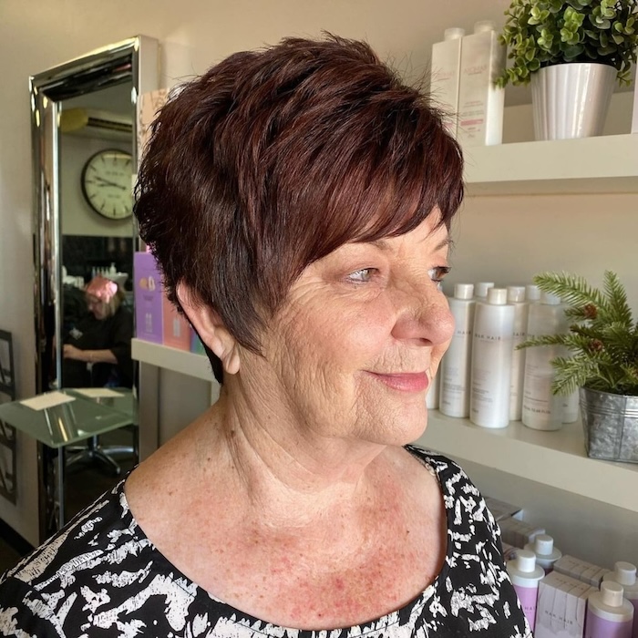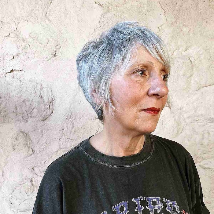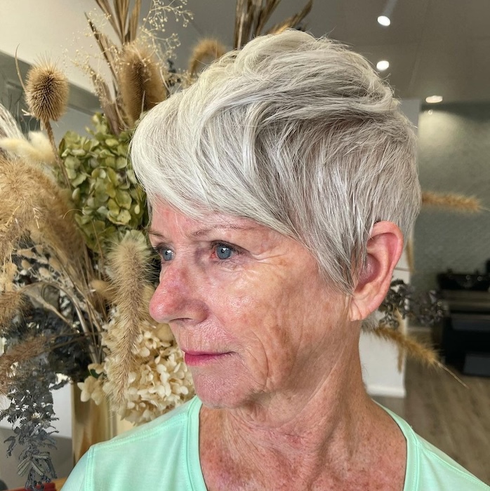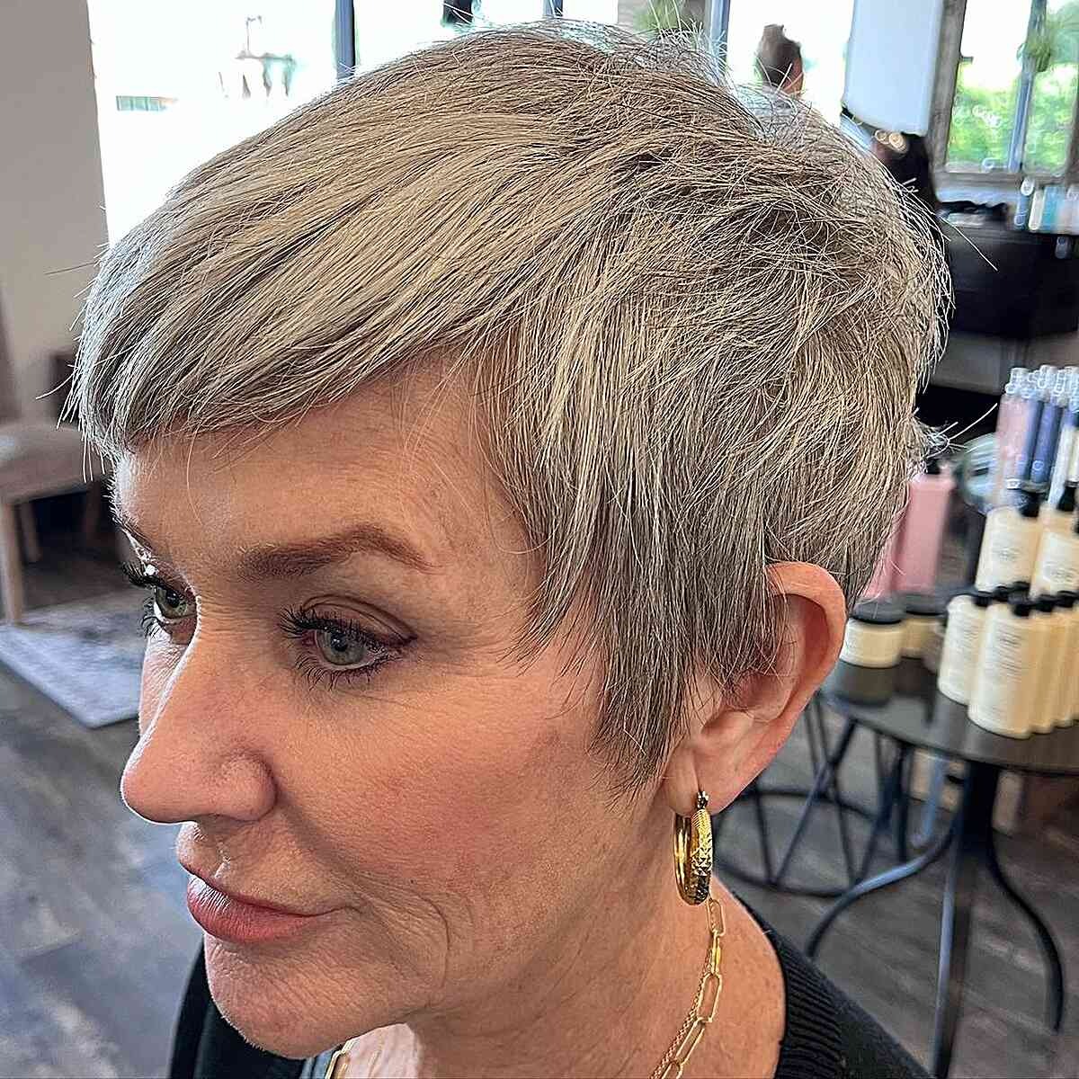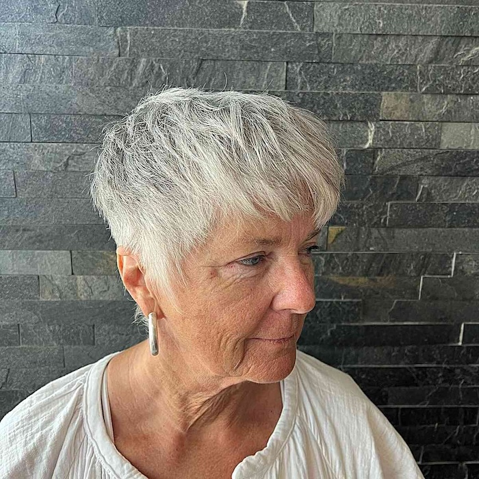 Who wouldn’t love to rock a chic pixie with wispy side bangs? This stylish look beautifully frames aging locks, adding youthful vibrancy and texture effortlessly.