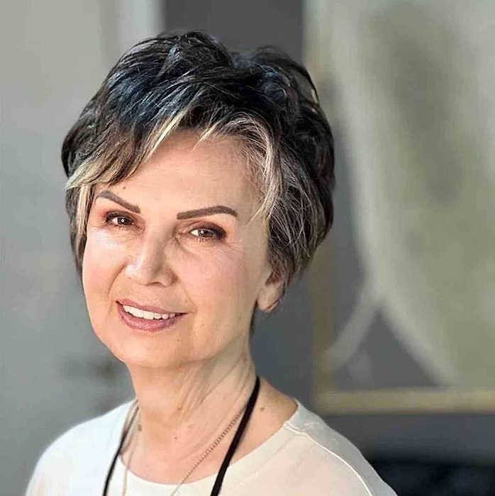 A very short pixie with grey balayage is a youthful way to embrace and enhance your natural hair color.