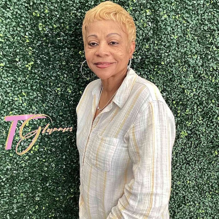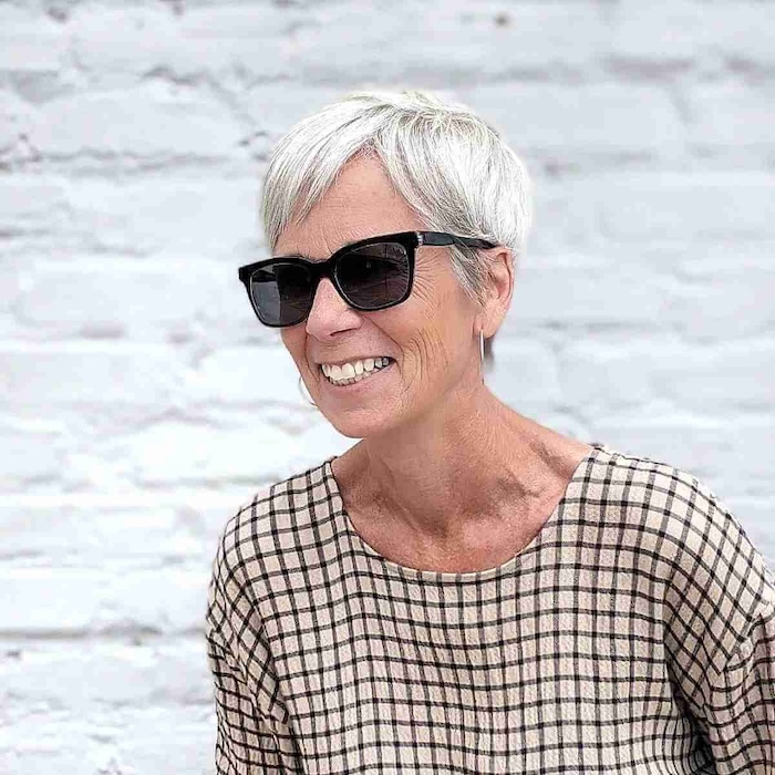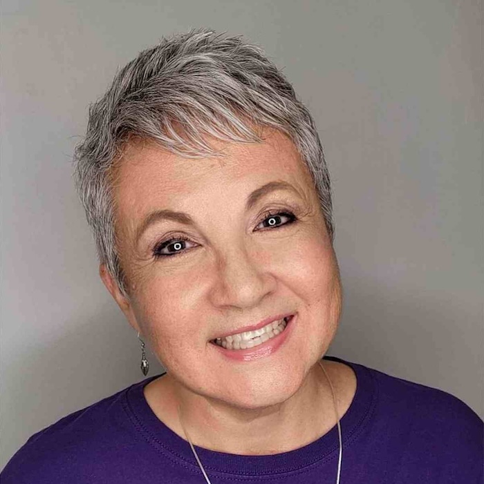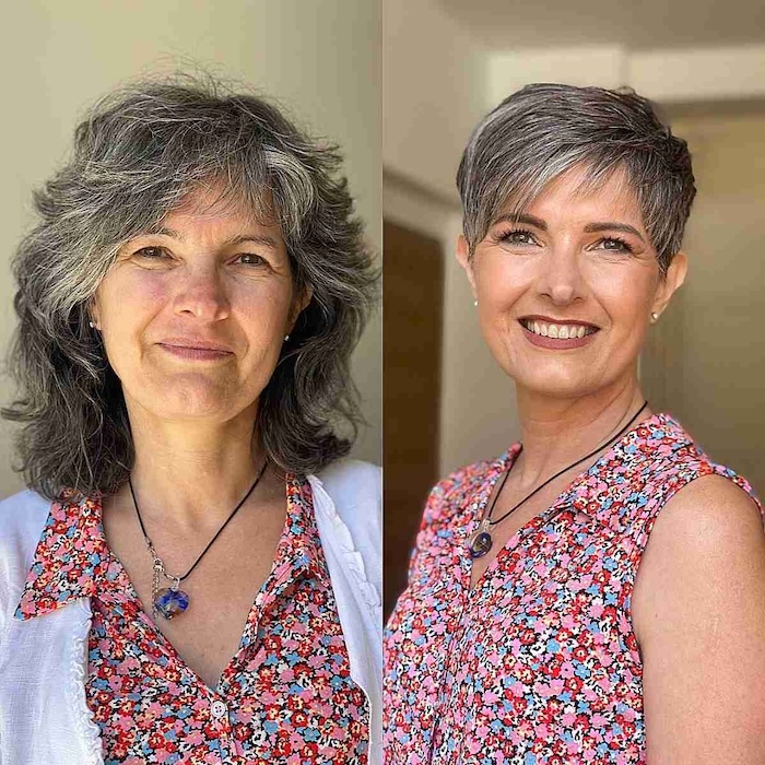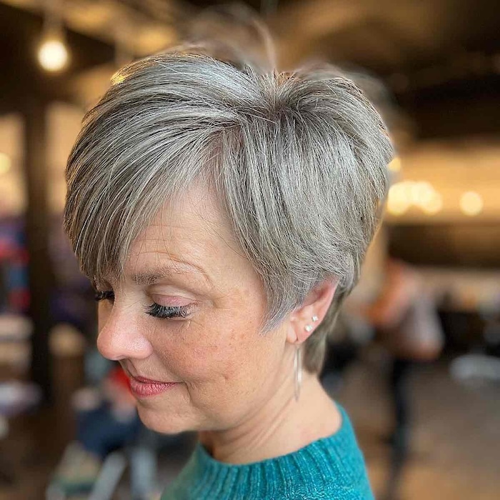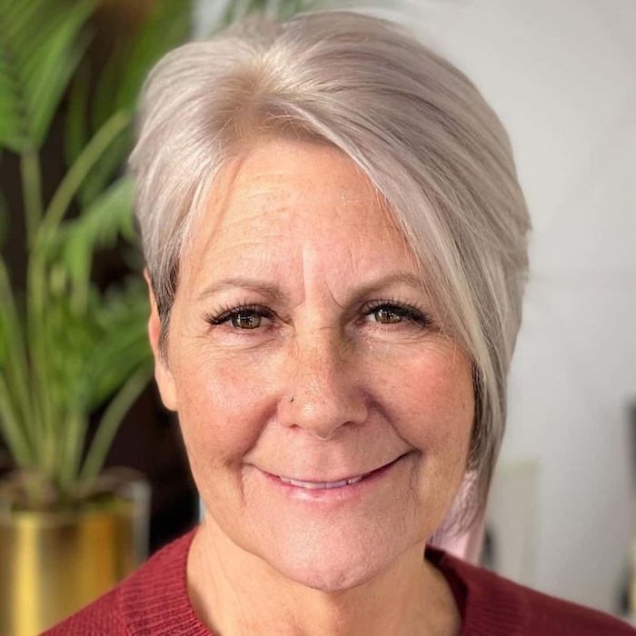 Consider trying a modern pixie if you’re ready to embrace your beautiful, natural hair color. Transitioning to a pixie cut from longer hair can be rejuvenating and refreshing, making your face glow and appear younger.