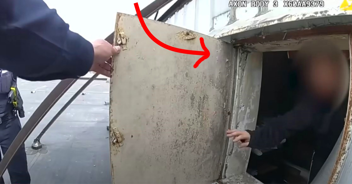 In an unexpected twist of events, body camera footage captures police officers confronting a woman living inside a sign above a Family Fare grocery store in Midland, Michigan.