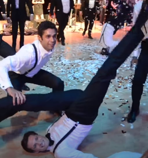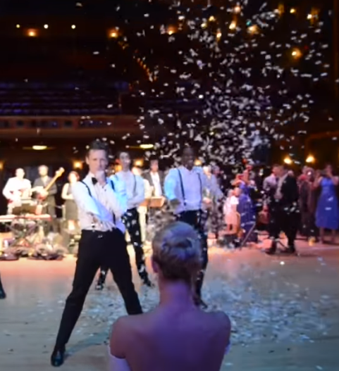 Confetti starts raining from the ceiling, giving the dance that additional music video feel. The guests love it! Kirk and friends pull out the boyband moves this time and it really suits their look!