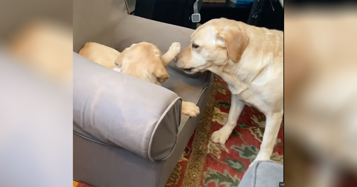 We all know what it is like to want what someone else has. If you have siblings you especially know what this feels like. Whether it’s Christmas presents, clothes, food, or your favorite spot on the couch when coexisting with each other sometimes arguments can ensue when these things are taken without permission or favorite spots are claimed. This is the case for a dog named Stella on Youtube. All she wanted to do was plop down in her favorite couch chair to rest her head for the day. However, when she got to her favorite spot her younger sibling Mabel seems to have taken residence.