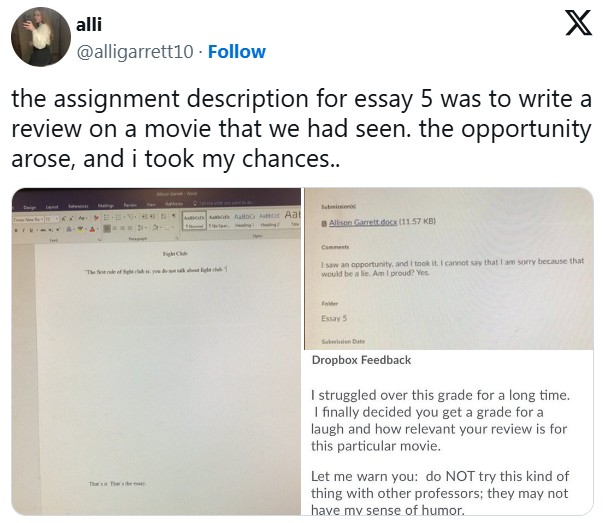 We can’t believe this student got away with it—she wrote just one sentence for her Fight Club movie review. Luckily, the professor caught the reference and appreciated the joke.